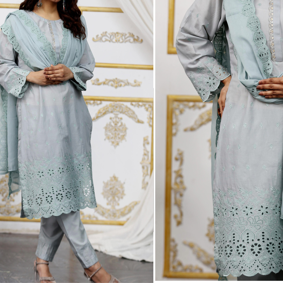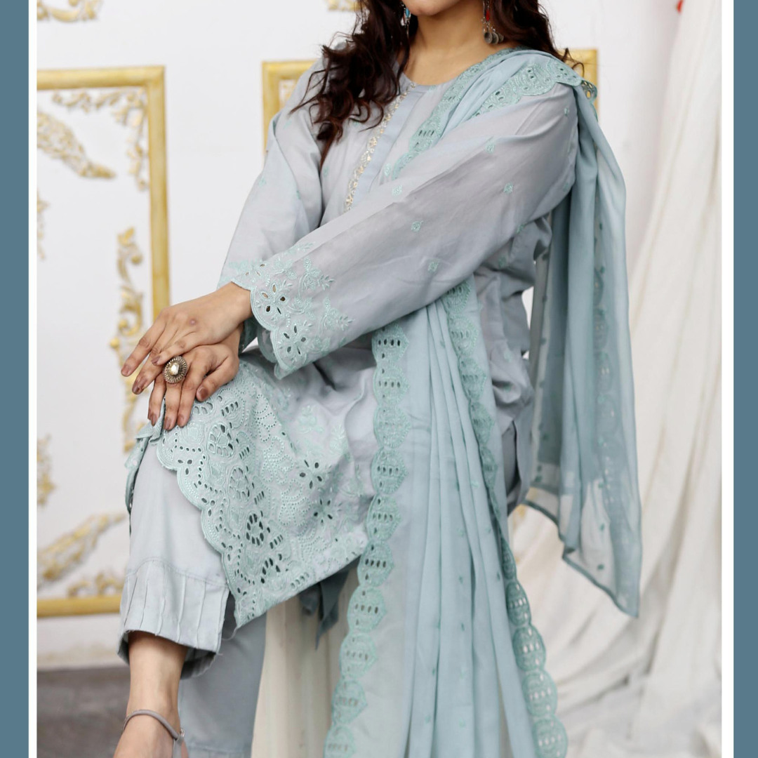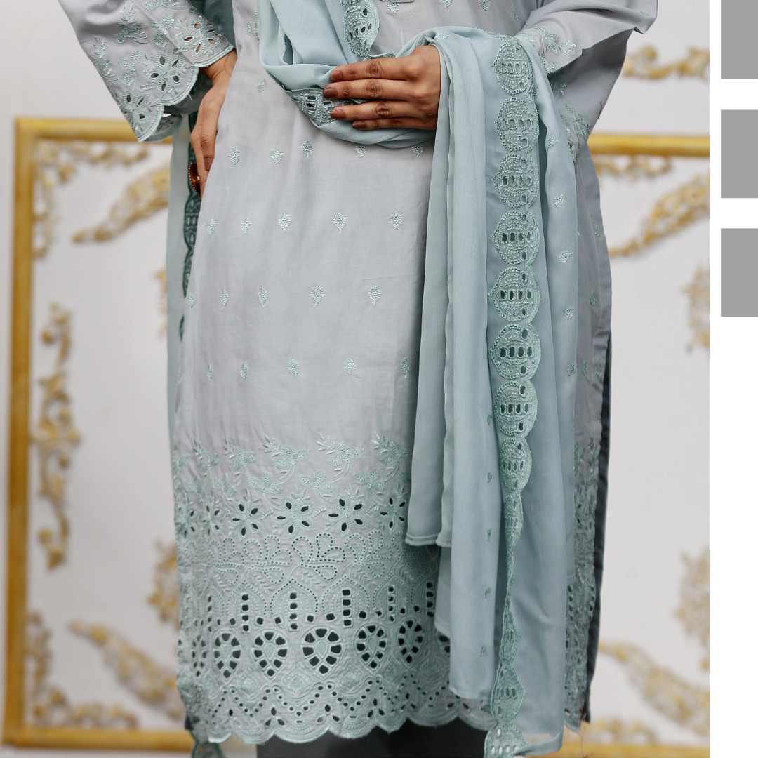 Elevate your summer wardrobe with Drexup's exquisite Zarlish Embroidered Lawn Chicken Kari ensemble. This unstitched masterpiece features: