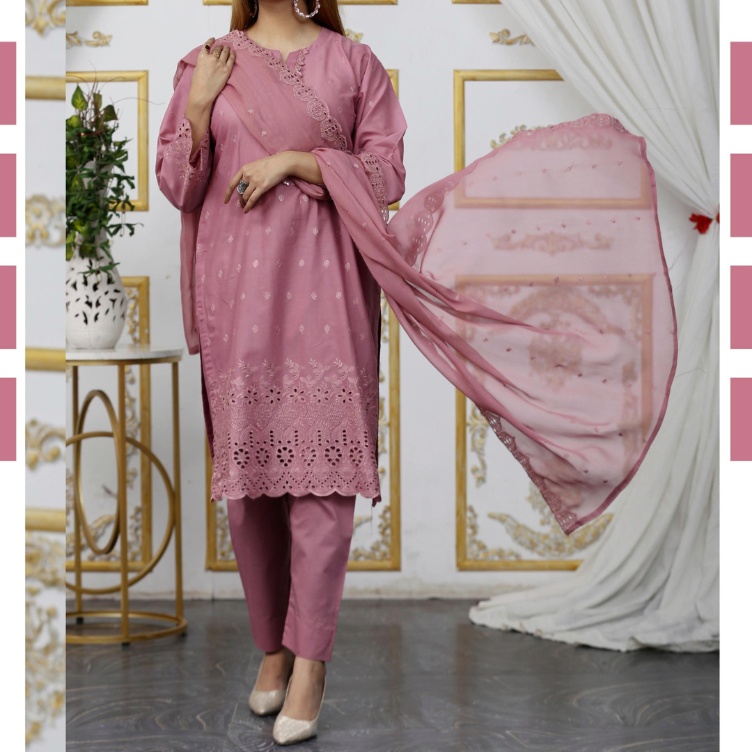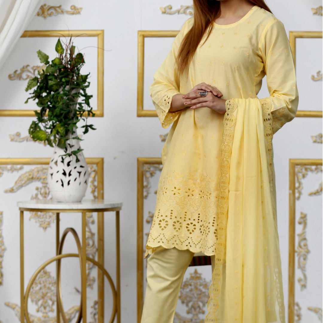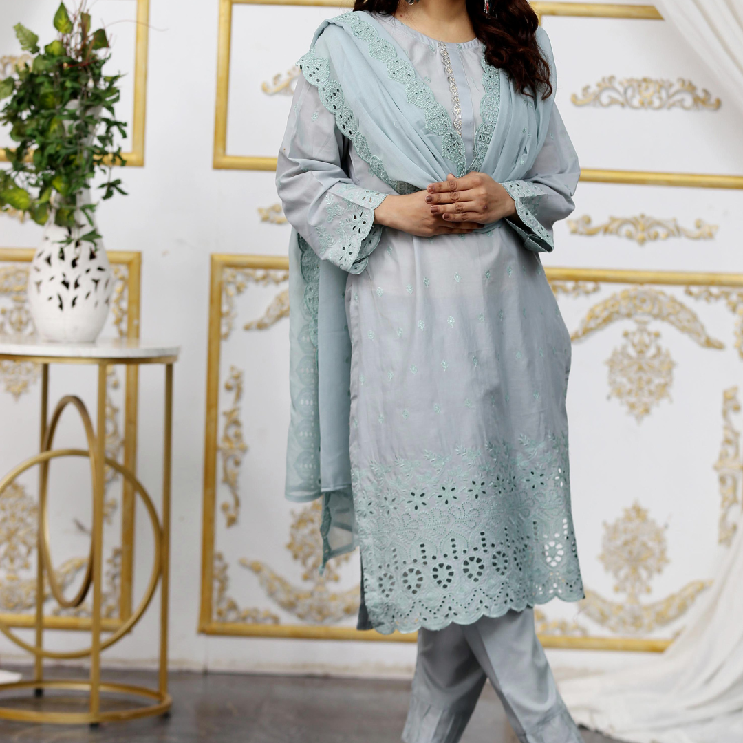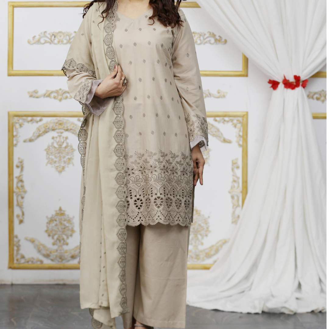 Elevate your summer wardrobe with Drexup's exquisite Zarlish Embroidered Lawn Chicken Kari ensemble. This unstitched masterpiece features: