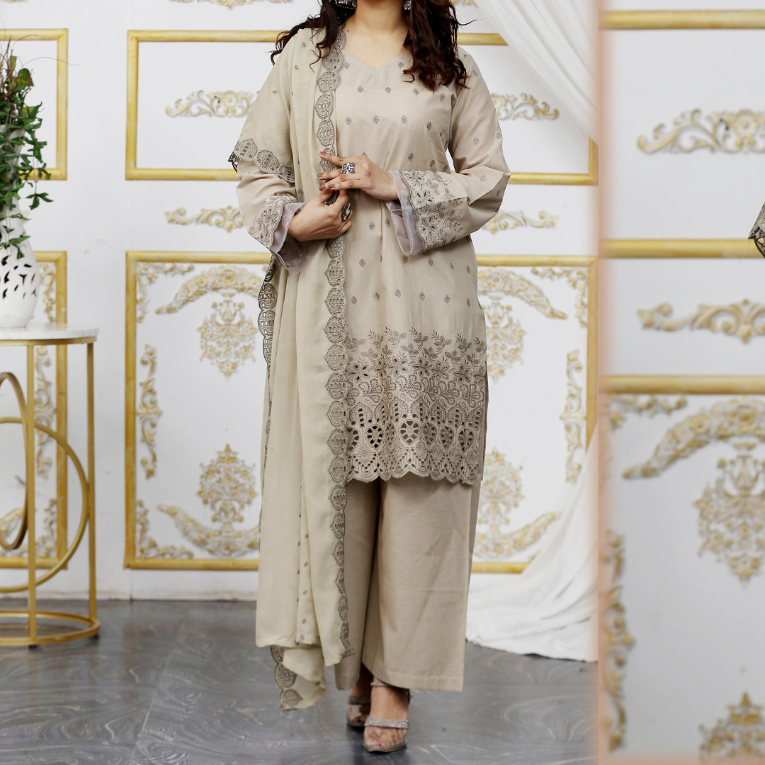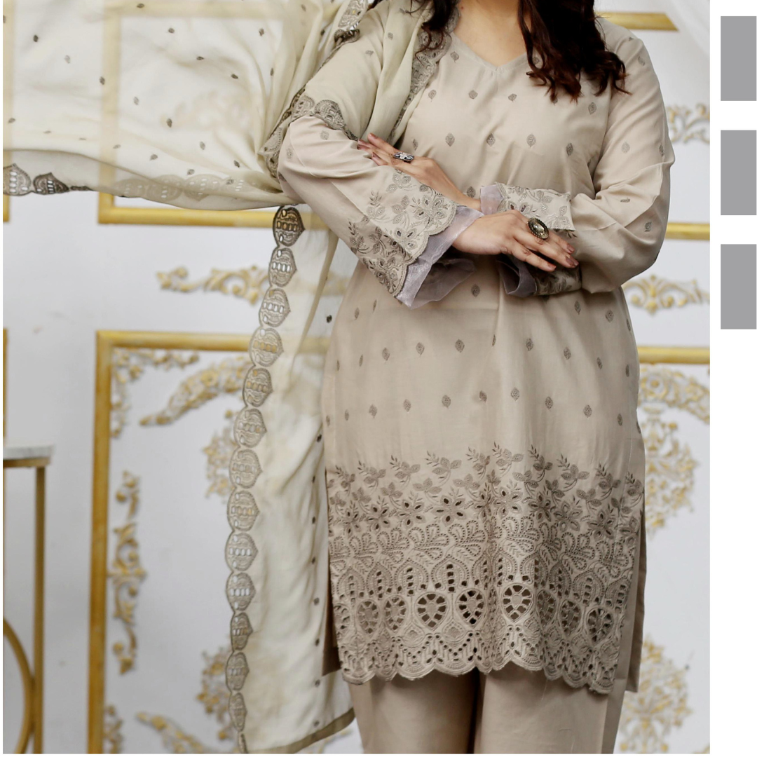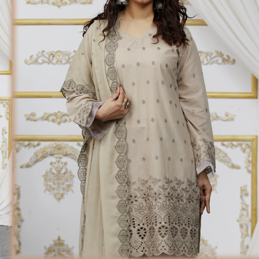 Elevate your summer wardrobe with Drexup's exquisite Zarlish Embroidered Lawn Chicken Kari ensemble. This unstitched masterpiece features: