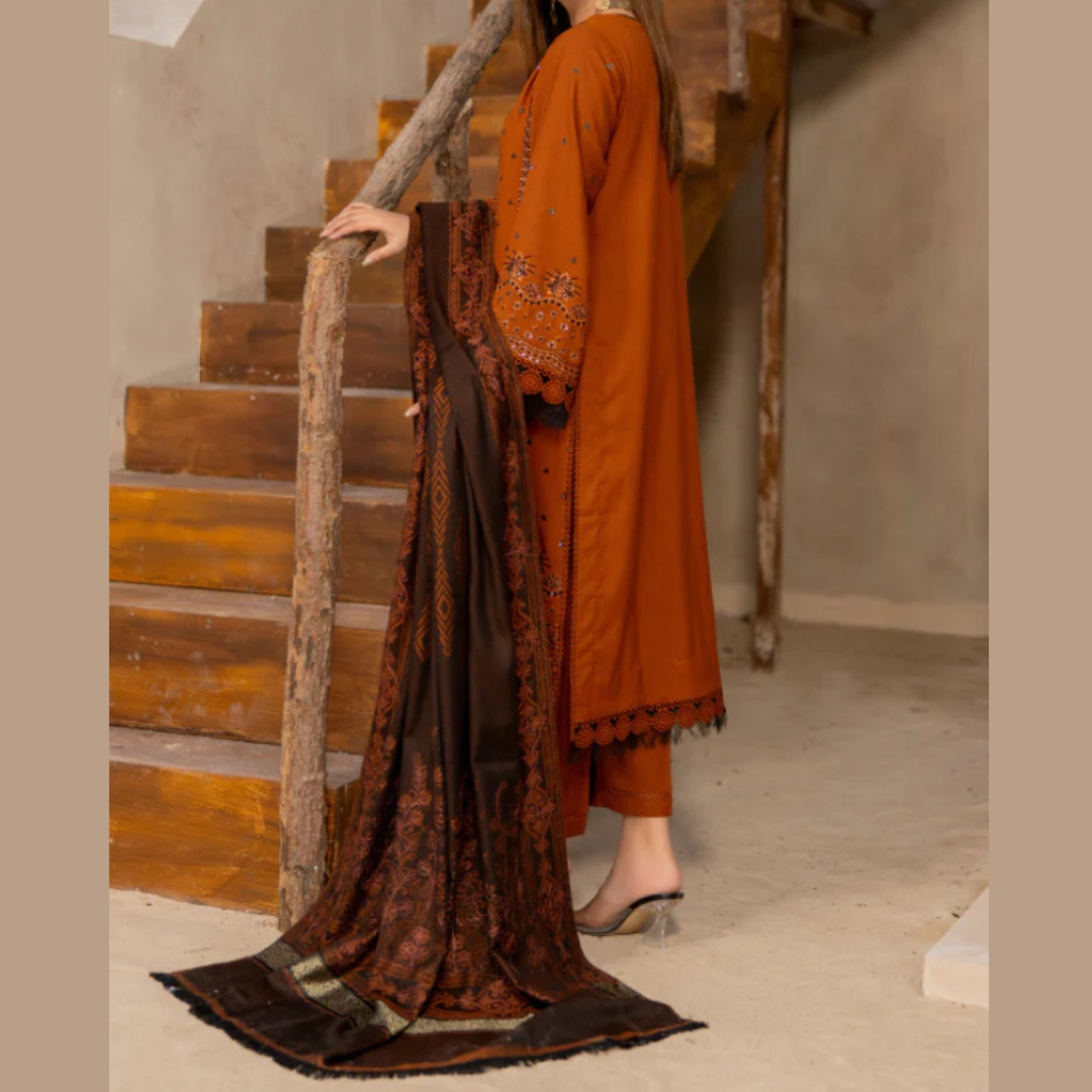 Elevate your winter wardrobe with the Gul-posh Winter Luxury Collection by Waresha. Featuring intricately designed, heavy embroidered wool shawls, this collection combines elegance and warmth, making it the perfect addition to your luxurious winter style. Experience premium craftsmanship and timeless sophistication with Waresha’s latest Vol 22 collection. Embroidered Shirt – Front panel adorned with intricate embroidery. Embroidered Sleeves – Stunningly detailed to complement the shirt. Plain Back – Designed for a seamless look. Trouser – Tailored for comfort and style. Wool Self-Jacquard Shawl – Luxuriously soft with a unique textured design.